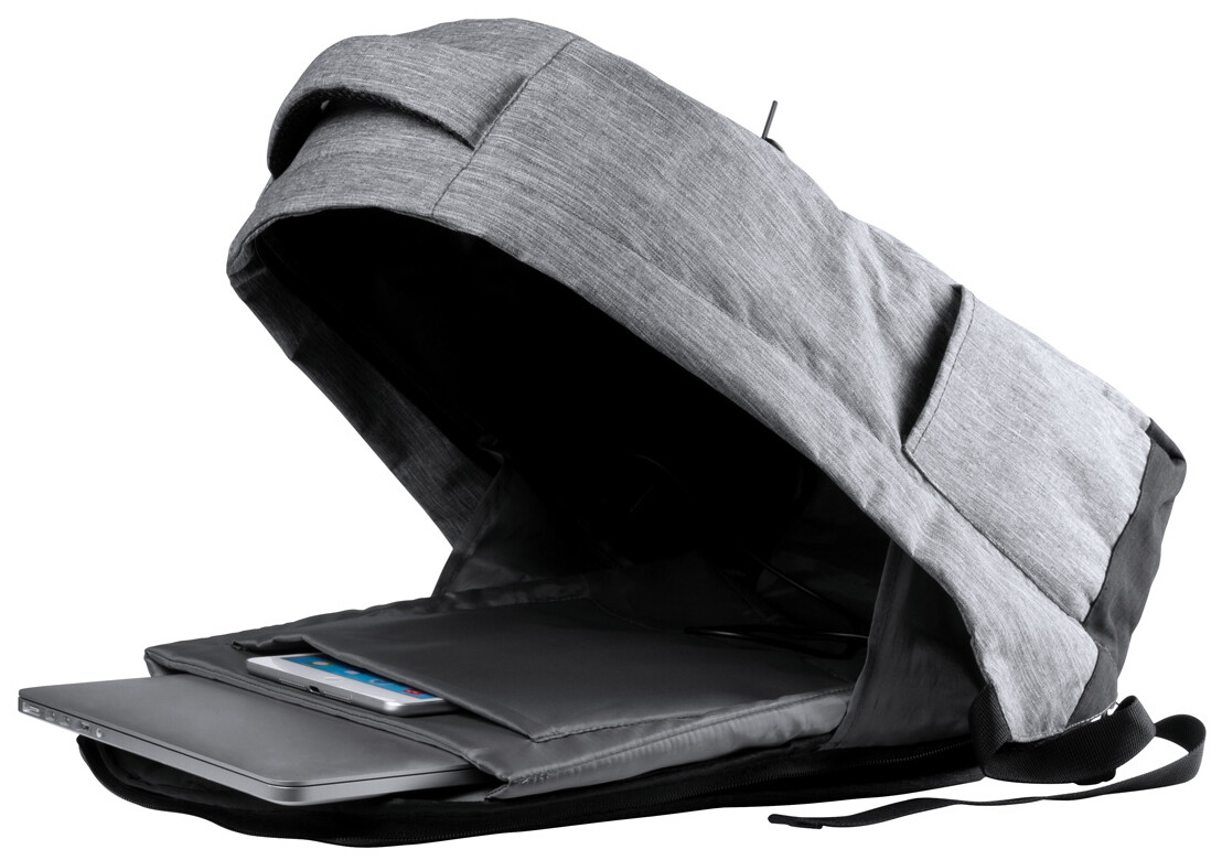Voděodolný batoh s ochranou proti krádeži s několika přihrádkami na zip, polstrovaným prostorem pro laptop (15 ") a tabletem (12"), polstrovanými zády a ramenním popruhem. S vestavěným USB připojením pro power banky. 300D Polyester.