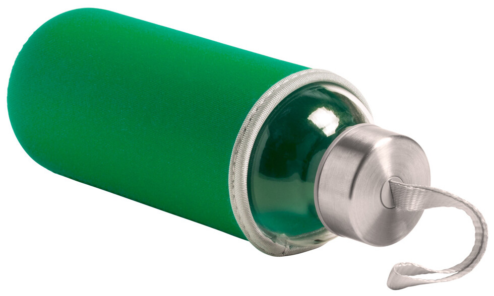 Skleněná láhev s popruhem na uzávěru a barevným neoprenovým krytem. 420 ml. Nevhodné pro sycené nápoje.