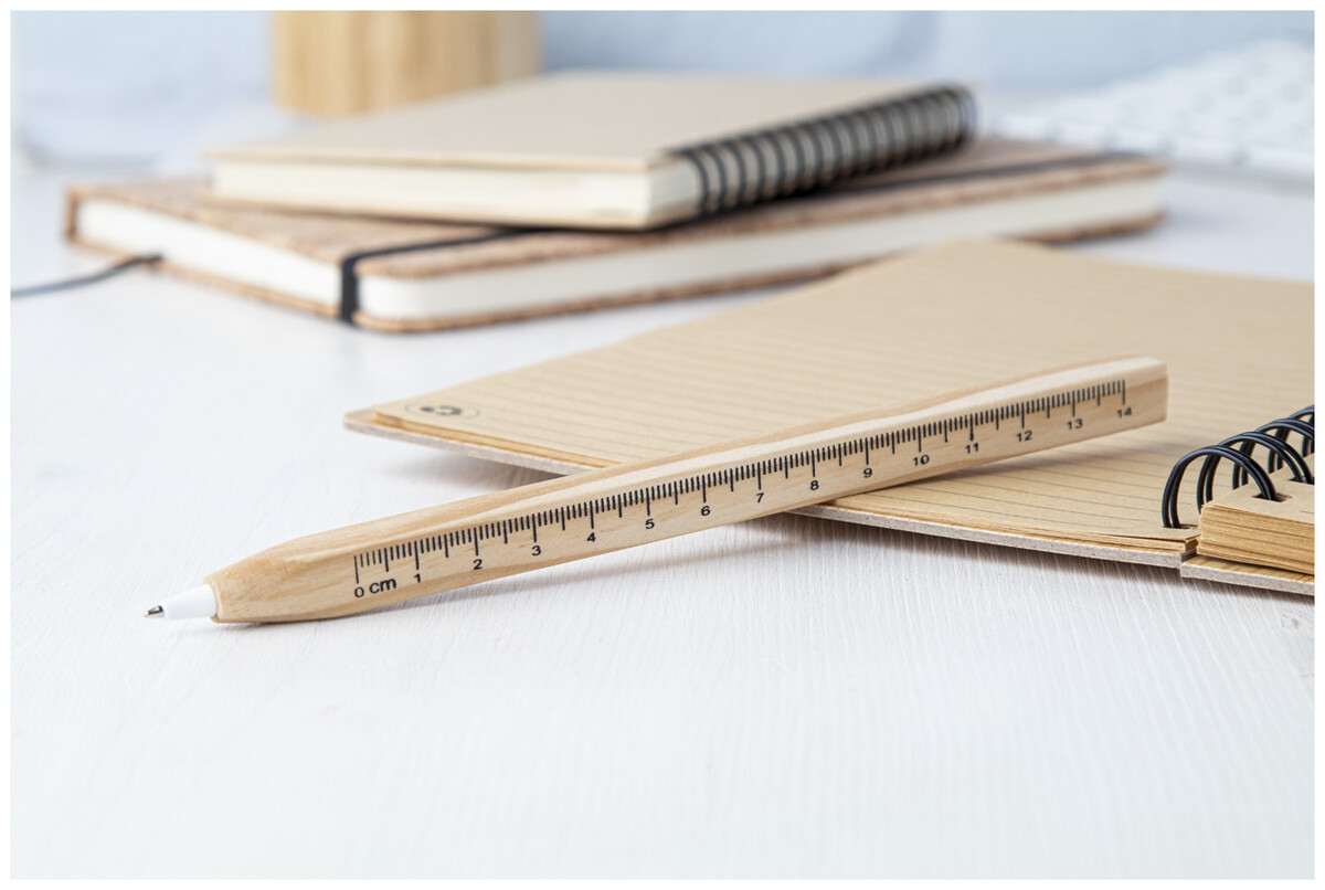 Dřevěné čtveraté kuličkové pero s 14 cm pravítkem na jedné straně, s modrou náplní.