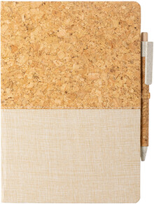 Blok A5 s deskami z přírodního korku a bavlny a 80 čistými listy. Vč. kuličkového pera z korku a pšeničné slámy, s černou náplní.