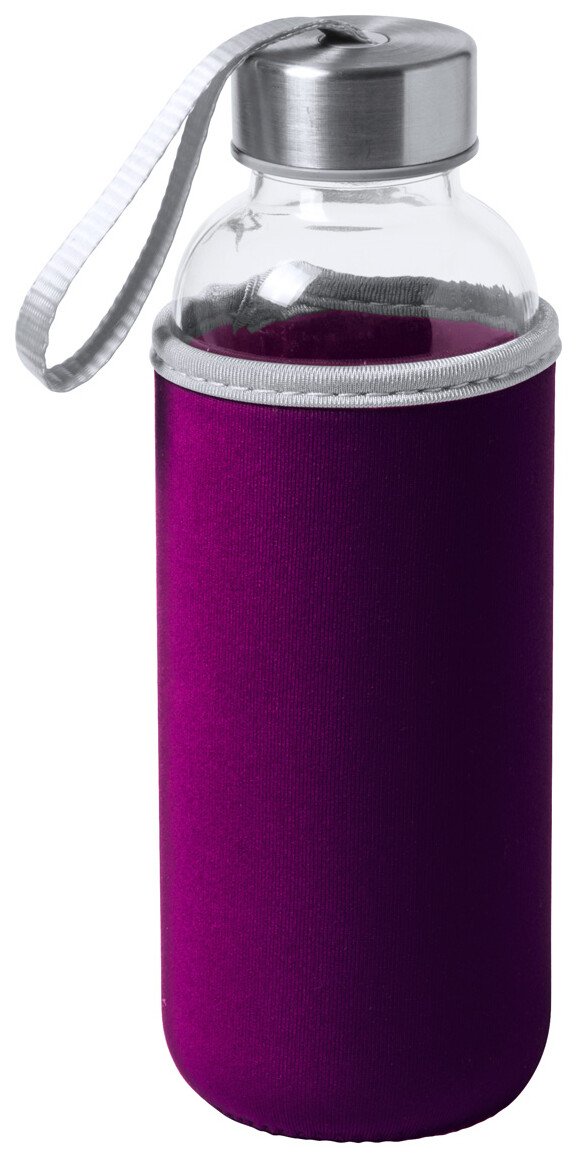 Skleněná láhev s popruhem na uzávěru a barevným neoprenovým krytem. 420 ml. Nevhodné pro sycené nápoje.