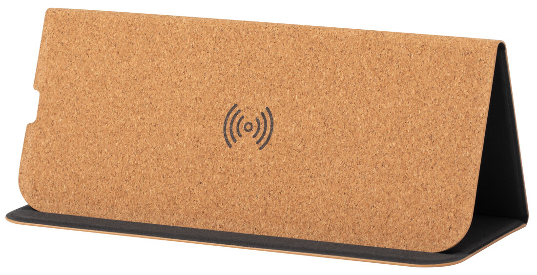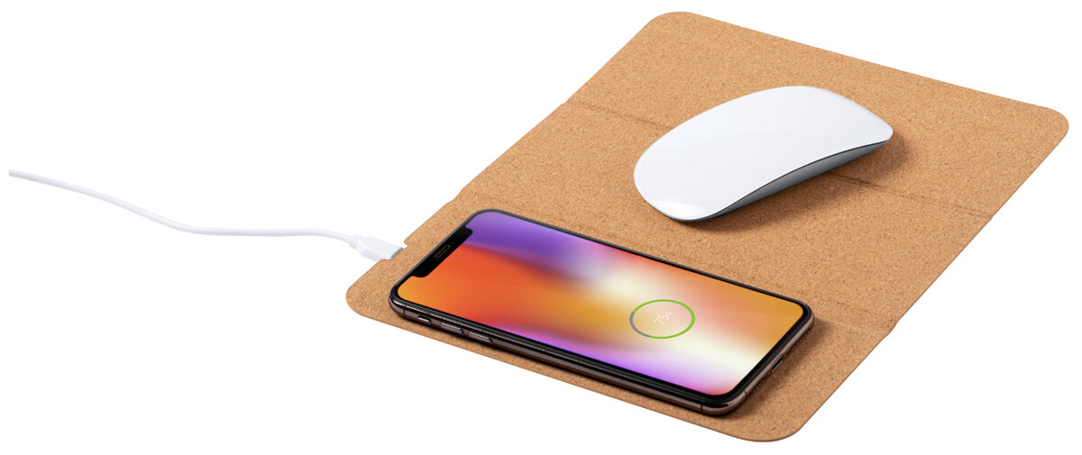 Podložka pod myš z přírodního korku s vestavěnou bezdrátovou nabíječkou (5W) a integrovaným držákem na mobilní telefon. Včetně nabíjecího kabelu USB-C. V krabičce z kraftového papíru.