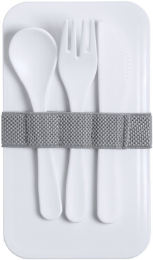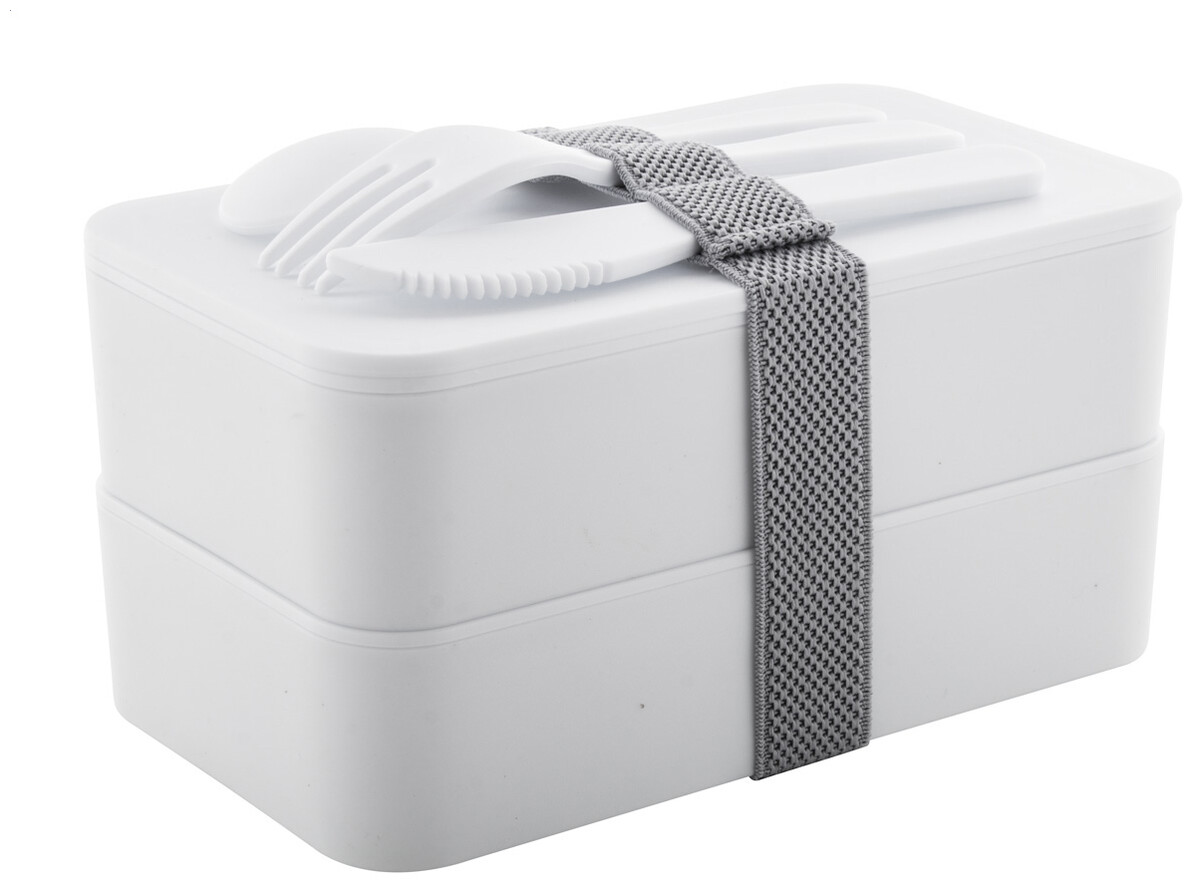 Box na jídlo z antibakteriálního plastu se sadou příborů (vidlička, lžíce a nůž) a elastickým popruhem. Každý má 2 oddíly o objemu 700 ml. V souladu s ISO 22196.