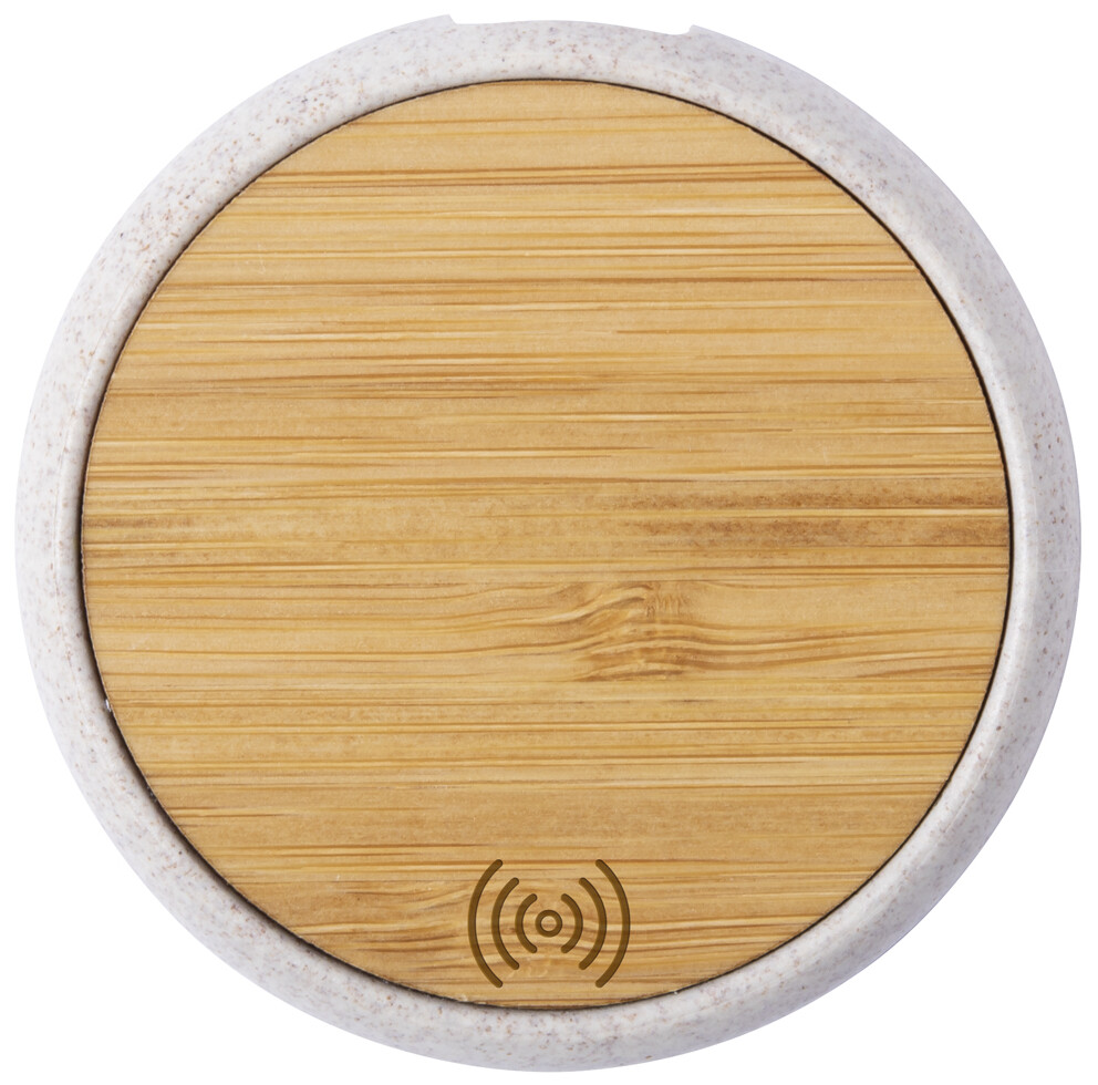 Bezdrátová nabíječka (10W) v plastovém pouzdře z bambusu a ekologické pšeničné slámy. Včetně kabelu USB.
