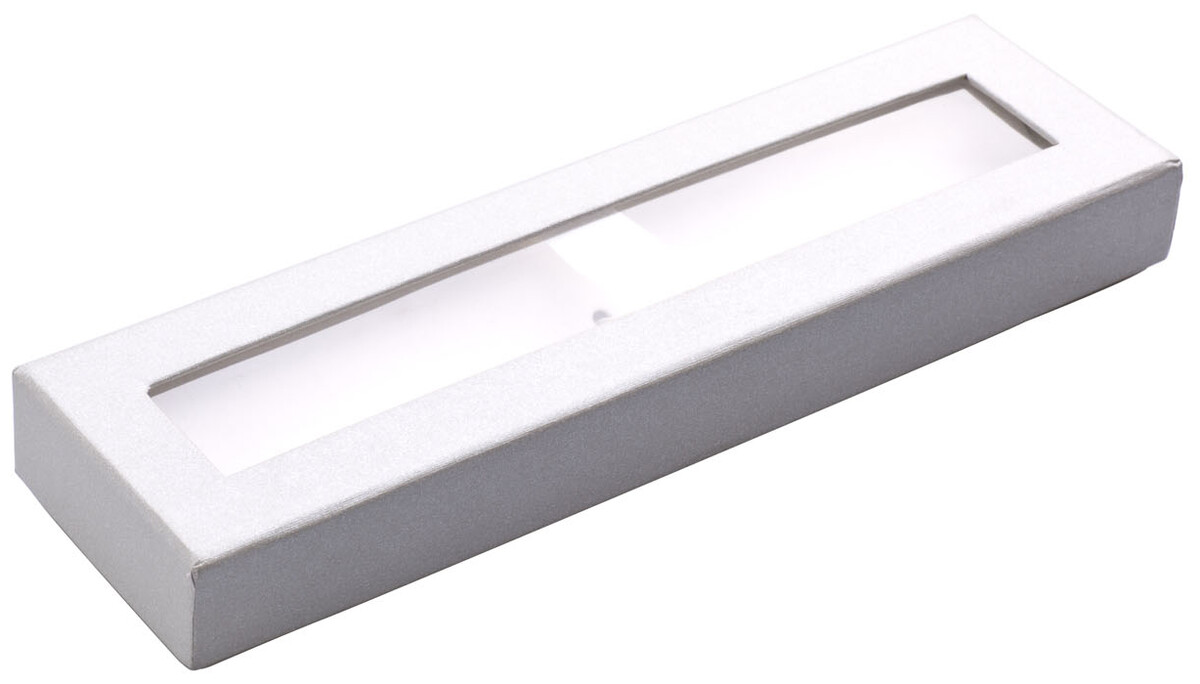 Dárková krabička na 1 tužku, stříbrný potahovaný papír a průhledné okénko v horní části