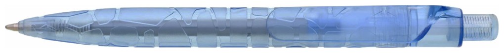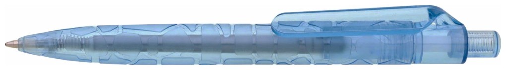 Plastová propiska z recyklovaných lahví s průhledným světle modrým tělem s reliefem a hladkým klipem určeným na tisk. Kolekce SAVE THE NATURE.