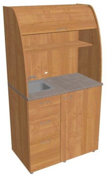 Dvě police ve vrchní části kuchyňky poskytují dostatečnou kapacitu pro vaše skleničky, hrnky či talíře. Na pracovní desku můžete umístit např. kávovar a kabelovou průchodkou v zadní části vyvedete přívodní kabel z prostoru kuchyňky.