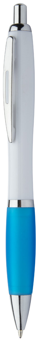 Plastové kuličkové pero s bílým tělem, barevným úchopem a lesklými chromovanými částmi. S modrou náplní.