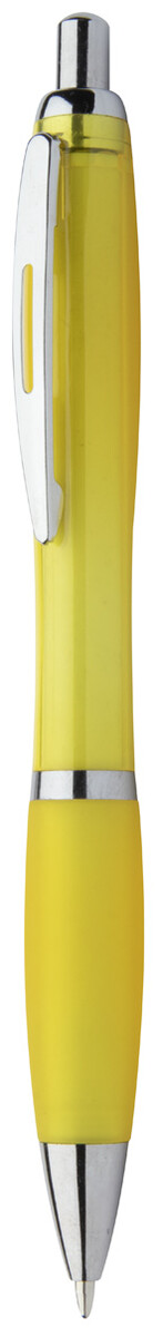 Plastové kuličkové pero s průhledným tělem, úchopem v odpovídající barvě a lesklými chromovanými částmi. S modrou náplní.