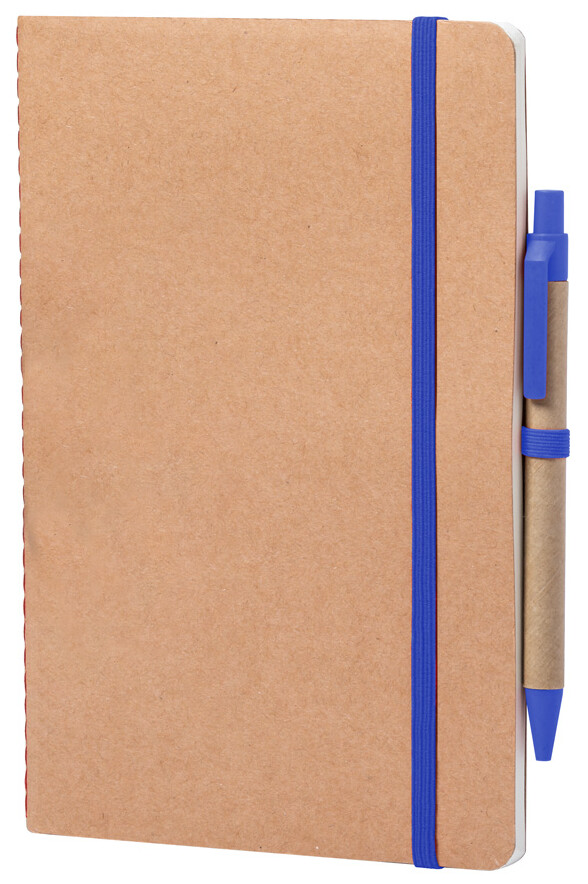 Blok A5 z recyklovaného kartonu s 60 čistými listy a barevnou gumičkou. Včetně plastového kuličkového pera z pšeničné slámy s modrou náplní.