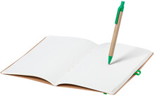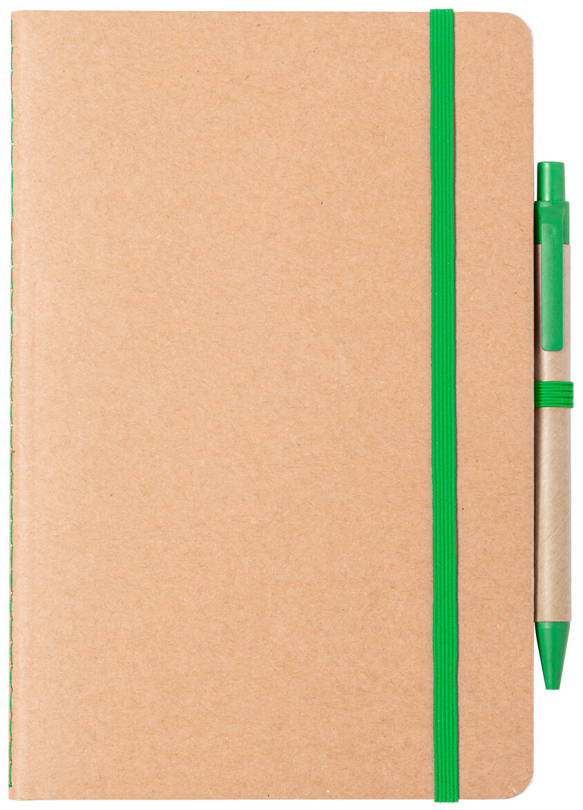 Blok A5 z recyklovaného kartonu s 60 čistými listy a barevnou gumičkou. Včetně plastového kuličkového pera z pšeničné slámy s modrou náplní.
