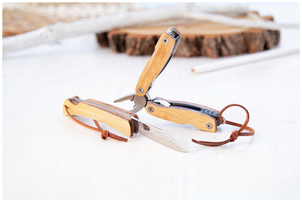 Multifunkční nářadí z nerezové oceli s bambusovými rukojeťmi a 12 funkcemi. S páskem z PU kůže.
