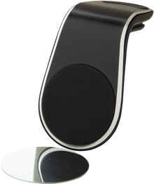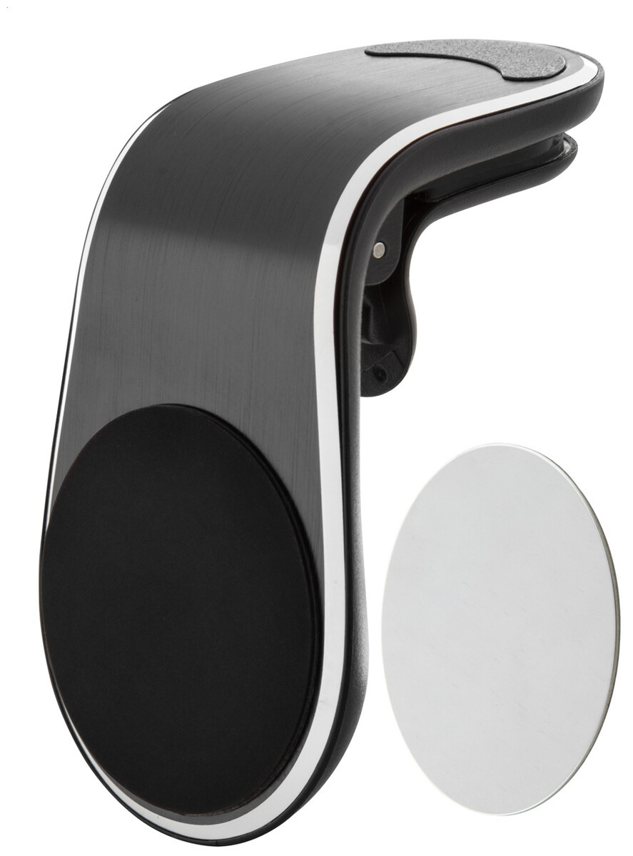 Hliníkový magnetický držák na mobilní telefon do auta s upevněním do větracího otvoru. Včetně samolepicího kovového plíšku.