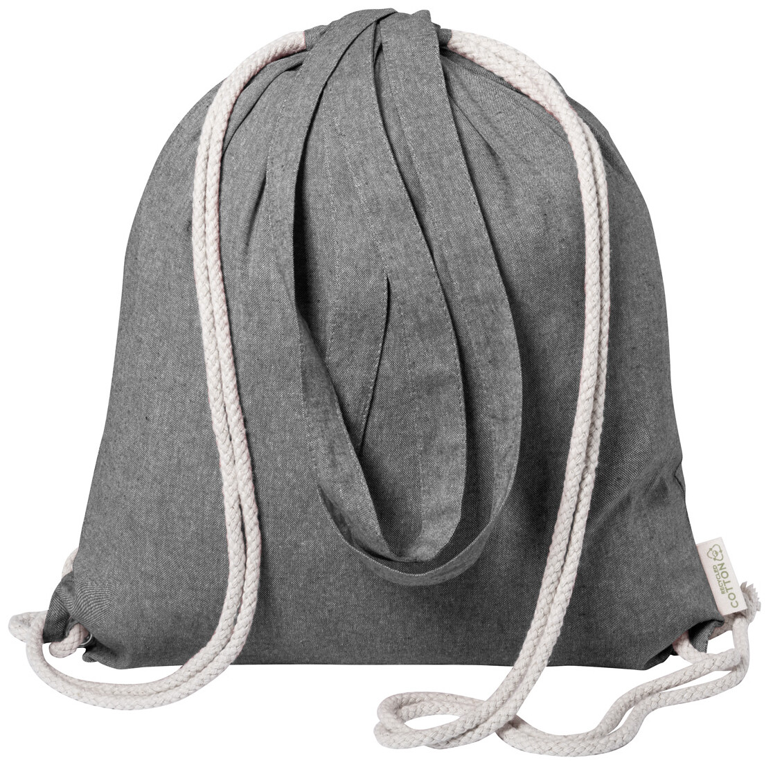 Vak na stahování šňůrkou z recyklované bavlny se silnými pletenými šňůrami a dlouhými uchy. Lze jej také použít jako nákupní tašku. 100% recyklovaná bavlna, 140 g/m2.
