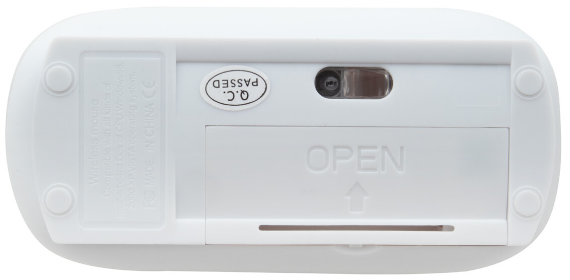 Bezdrátová plastová optická myš. Pracuje se 2 bateriemi AAA, dodáváno bez baterií. Toto zařízení používá nešifrované bezdrátové RF připojení; proto není možné provozovat více kusů ve stejné místnosti (nebo v okruhu 10 metrů).