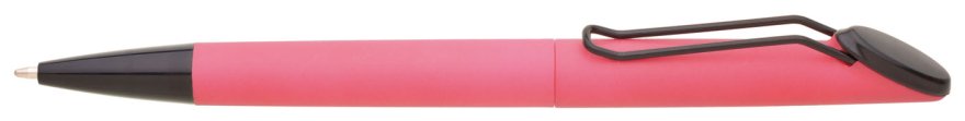 Plastová otočná propiska ARESTA v neonově růžové barvě s černou špičkou a černým kovovým klipem. Na držák klipu je možné umístit epoxy samolepku. Náplň velkoobsahová, modře píšící.