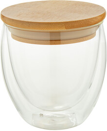 Dvoustěnný termohrnek z borosilikátového skla s bambusovým víčkem, 300 ml. V kraftové papírové krabici.