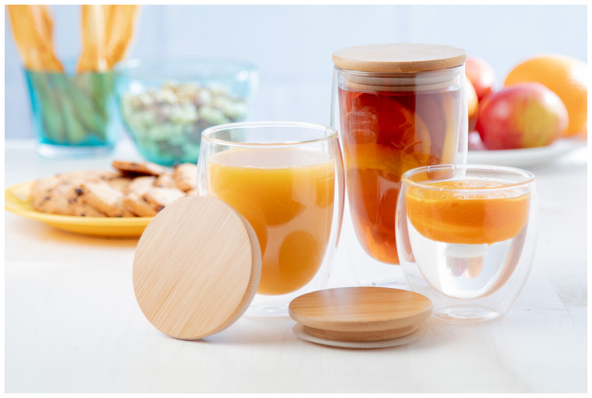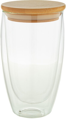 Dvoustěnný termohrnek z borosilikátového skla s bambusovým víčkem, 420 ml. V kraftové papírové krabici.
