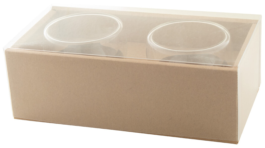 Sada šálků na espresso z borosilikátového skla s dvojitou stěnou, 2 ks šálků a bambusovými podšálky, 90 ml. V krabičce ze sulfátového papíru.