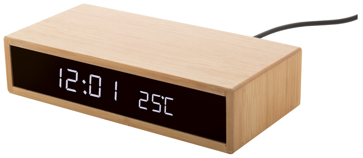 Multifunkční budík v bambusovém pouzdře s LED displejem, teploměrem a vestavěnou bezdrátovou nabíječkou (10W). Včetně USB nabíjecího kabelu.