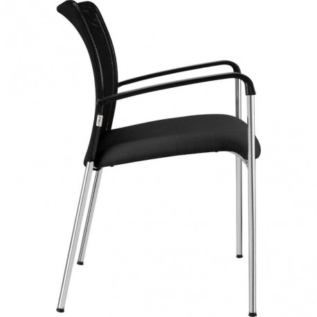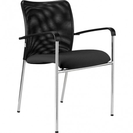 Moderní stohovatelná konferenční židle s područkami, se sedákem čalouněným v potahové látce Fill 9 (černá) a opěrákem opatřeným černou prodyšnou síťovinou. Kostra chromovaná
