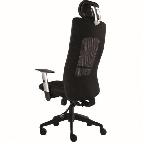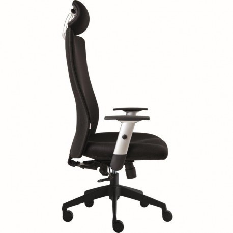 Otočná kancelářská židle se synchronní mechanikou s blokací ve zvolené pozici s pohodlným čalouněným sedákem, potaženým černou prodyšnou látkou. Výškově stavitelné područky, 3D nastavitelný podhlavník, prodyšný opěrák - černá síťovina