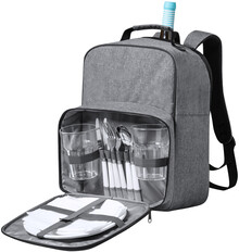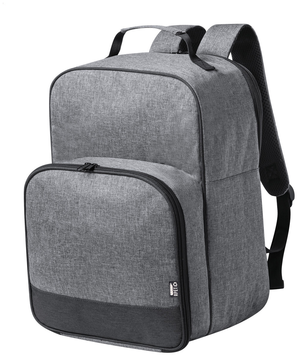 Chladící batoh na piknik RPET s polstrovanými popruhy a zády, chladicí přihrádka s polstrováním PEVA. Obsahuje 2 sklenice, 2 nože, 2 lžíce, 2 vidličky, 2 talíře a 2 ubrousky. Polyester 600D RPET s výrazným štítkem RPET.