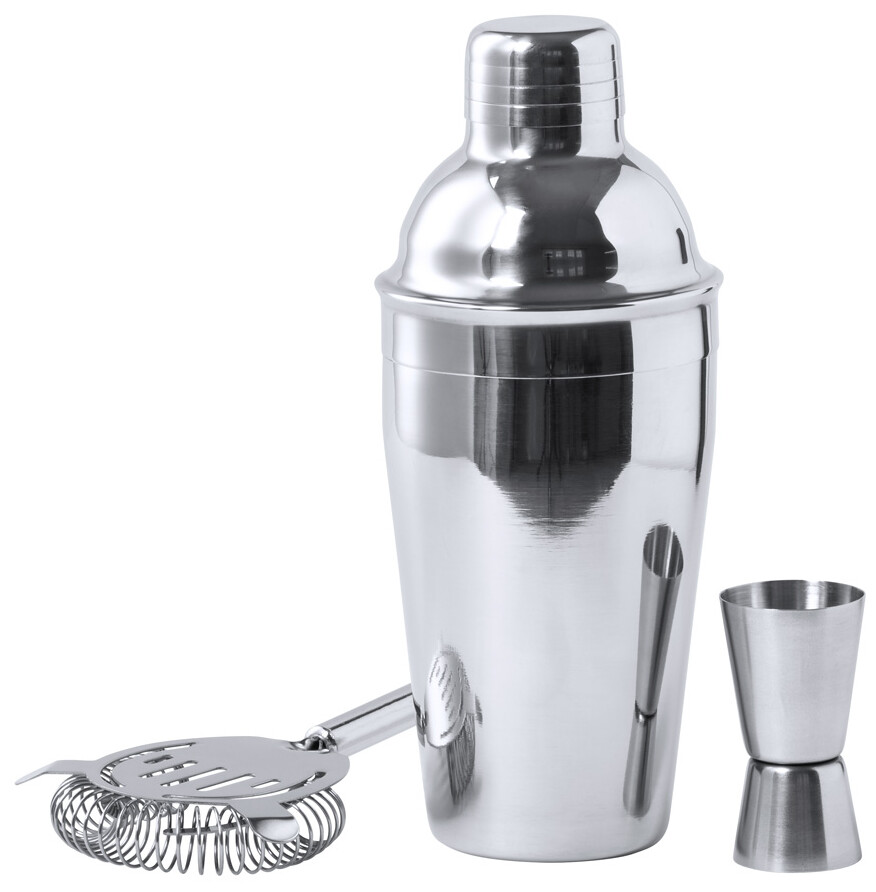 Nerezová koktejlová sada s 550 ml šejkrem, odměrkou a koktejlovým sítkem.