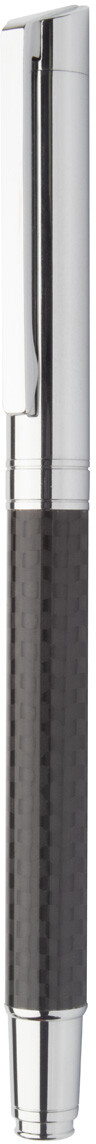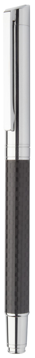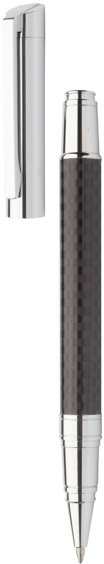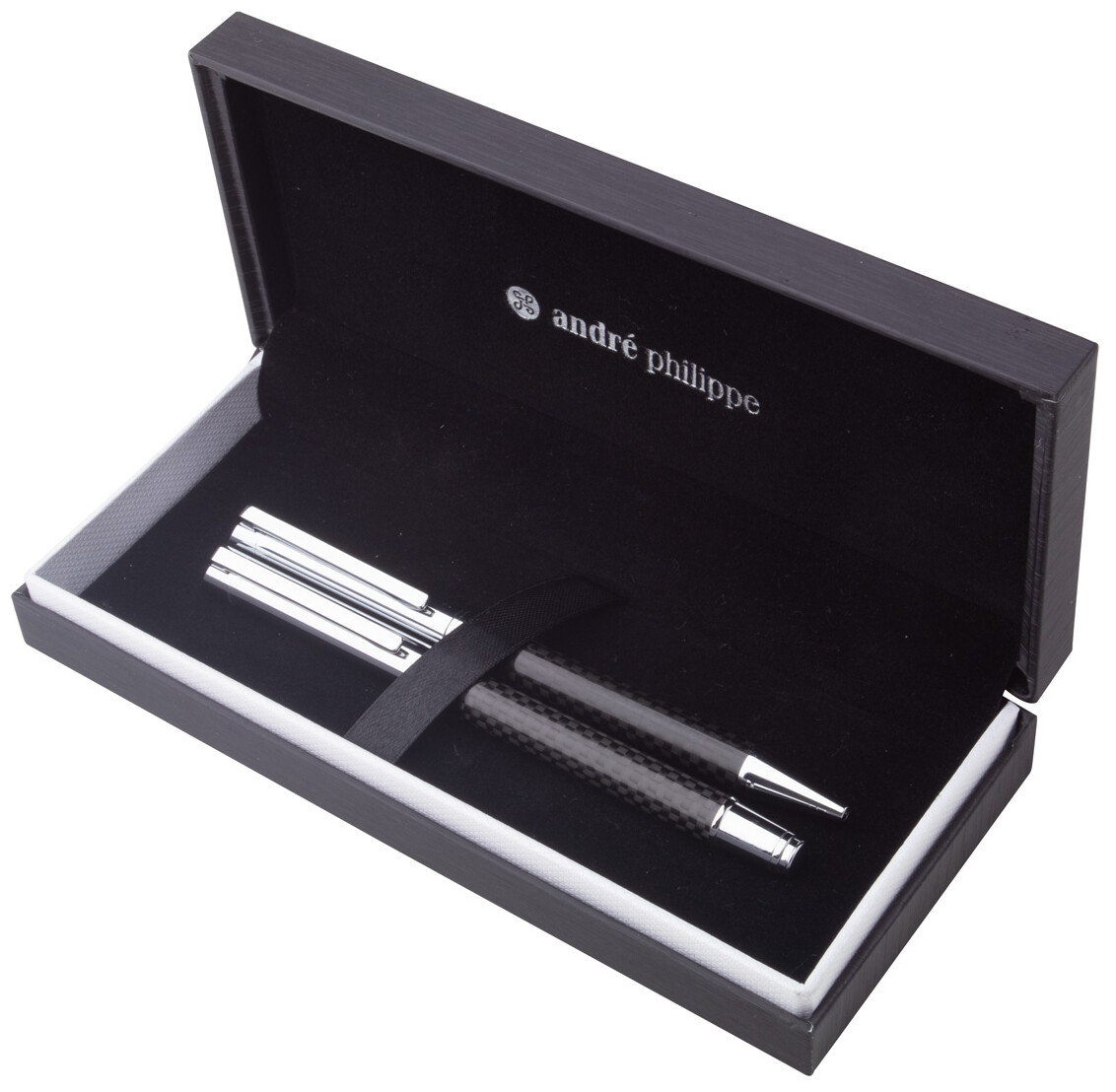 Elegantní sada kovového kuličkového pera a rolleru s karbonovým vzorem a lesklými chromovanými díly. V černé dárkové krabičce, s modrou náplní. Produkt značky André Philippe.