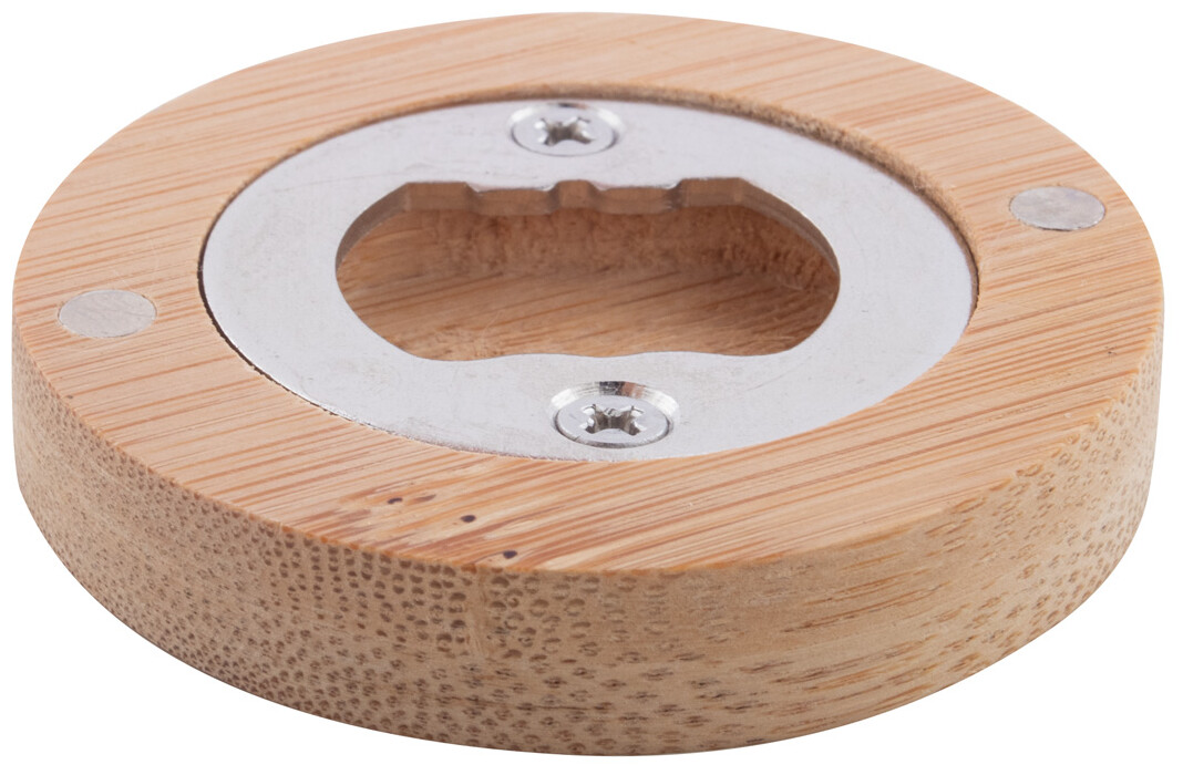 Bambusová magnetka na lednici kulatého tvaru s otvírákem na lahve.