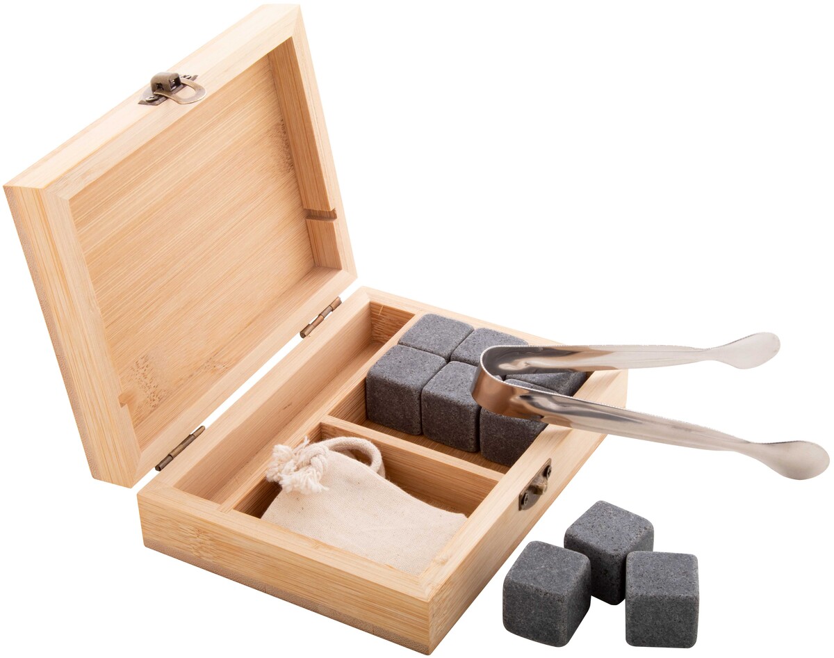 Opakovaně použitelná sada kamenných chladících kostek v bambusové krabičce. Obsahuje 9 kamenných kostek, bavlněný úložný sáček a nerezové kleště.