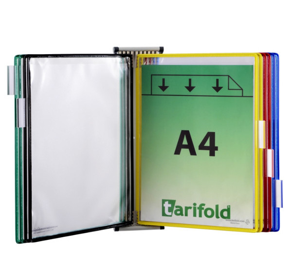 Šedý kovový nástěnný držák, vyrobený z ocelového lakovaného plechu s kapacitou 10 kapes. Dodáván jako komplet s 10 kapsami formátu A4 v různých barvách (modrá, červená, žlutá, zelená a černá). Pomůcky k upevnění držáku na stěnu součástí balení.