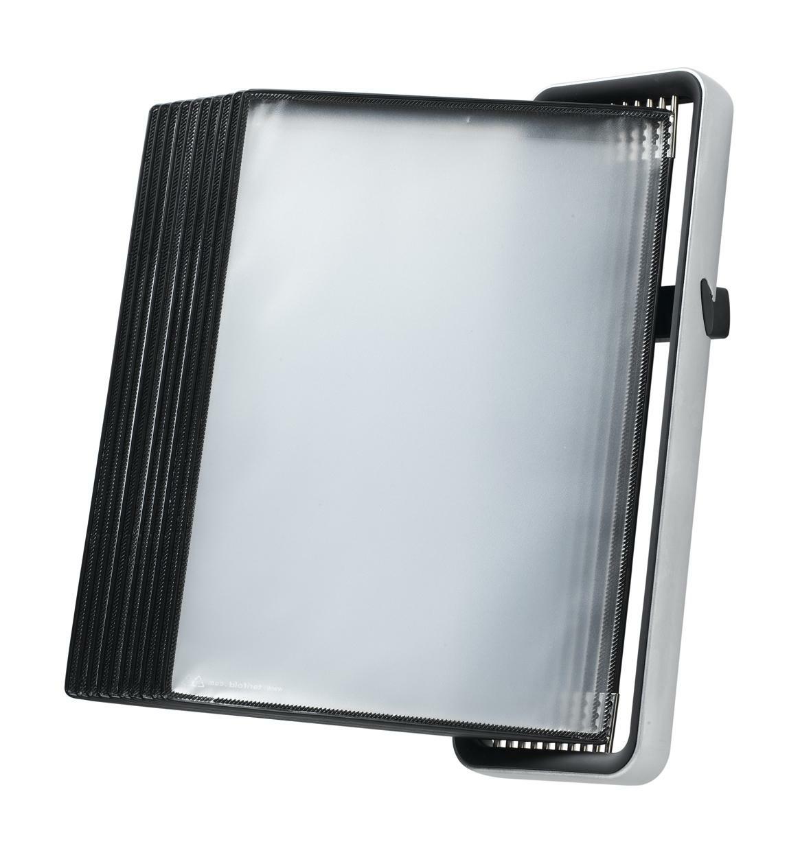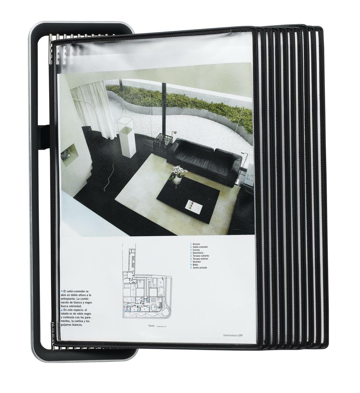 Prezentační nástěnný držák Tarifold veo, s 10 kapsami, černý je nástěnný držák s velmi stabilní kovovou konstrukcí v minimalistickém designu určený pro přehlednou prezentaci dokumentů formátu A4. Kapsy lze jednoduše vyjmout nebo vložit a držák je možné připevnit k jakémukoli pevnému povrchu.