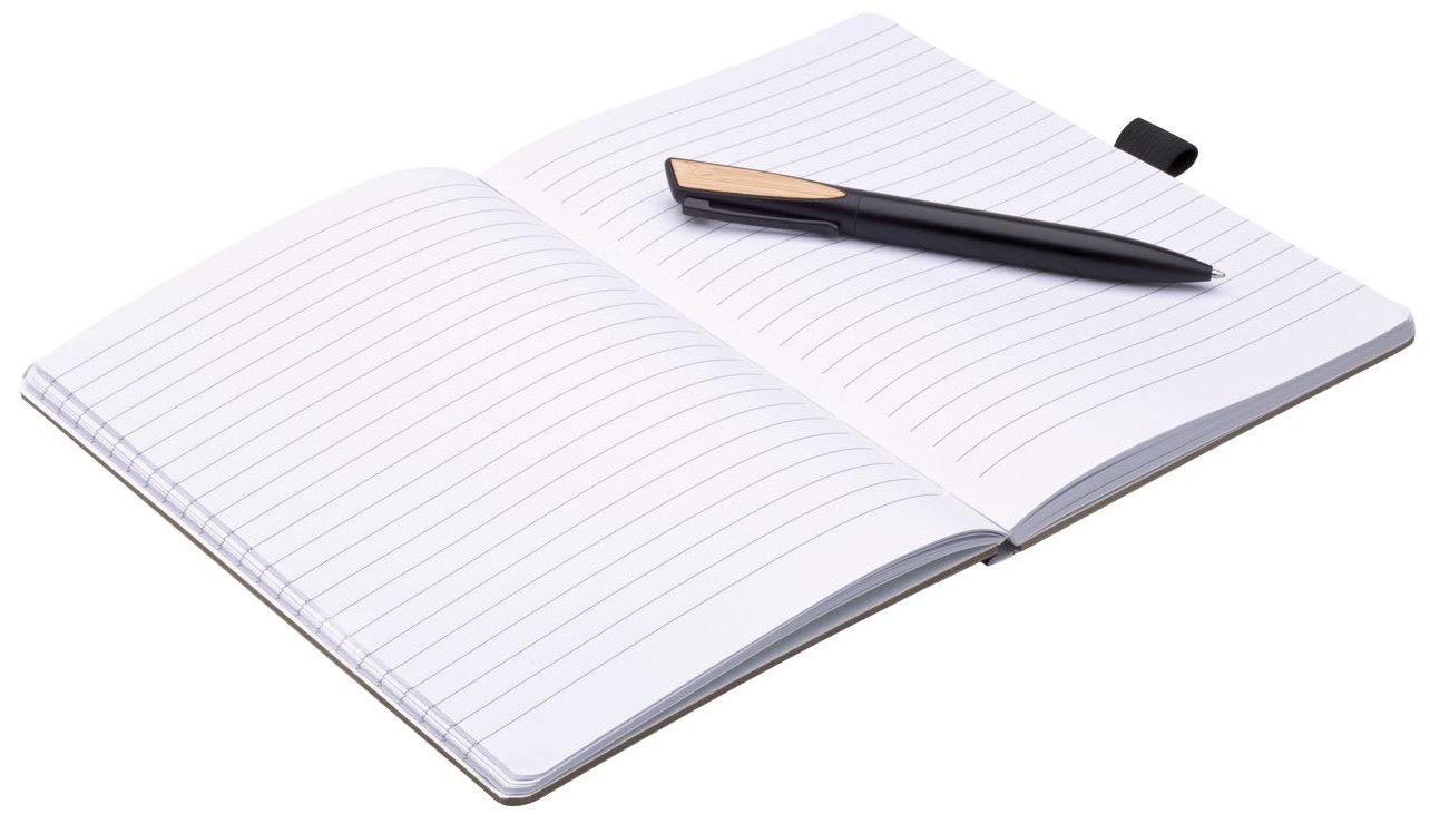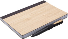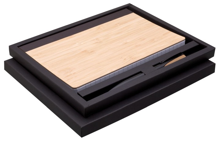 Poznámkový blok, zápisník s linkovaným papírem v bambusových deskách v černé dárkové krabičce. Součástí je černá propiska Quara.