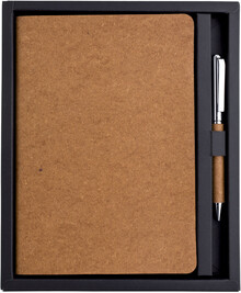Poznámkový linkovaný blok, zápisník v deskách z recyklované kůže s kovovou propiskou v černé dárkové krabičce.
