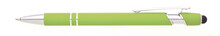 Propiska s touch koncem, měkkým pogumovaným soft povrchem ve světle zelené barvě a stříbrnými doplňky včetně dvou ozdobných kroužků. (NATIO)