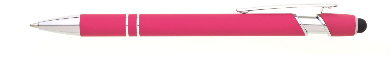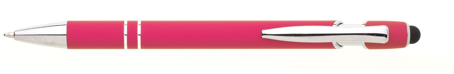 Propiska s touch koncem, měkkým pogumovaným soft povrchem ve růžové barvě a stříbrnými doplňky včetně dvou ozdobných kroužků. (NATIO)