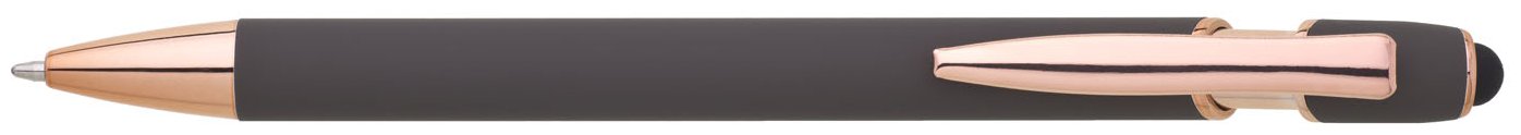 Kovová propiska se soft povrchem, touch koncovkou a doplňky v růžovo-zlaté barvě. Laserované logo je lesklé, růžovo-zlaté. Náplň modře píšící.