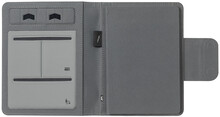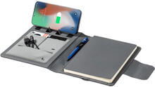 Polyesterová sloha na dokumenty A5 z 300D RPET se zápisníkem na 65 řádků, vestavěnou magnetickou bezdrátovou rychlonabíječkou (10W), power bankou 5000 mAh s portem pro nabíjení USB a skládacím držákem na mobil. Včetně samolepícího kovového kroužku pro použití magnetické funkce na jakémkoli bezdrátově nabíjecím zařízení. Včetně USB nabíjecího kabelu.