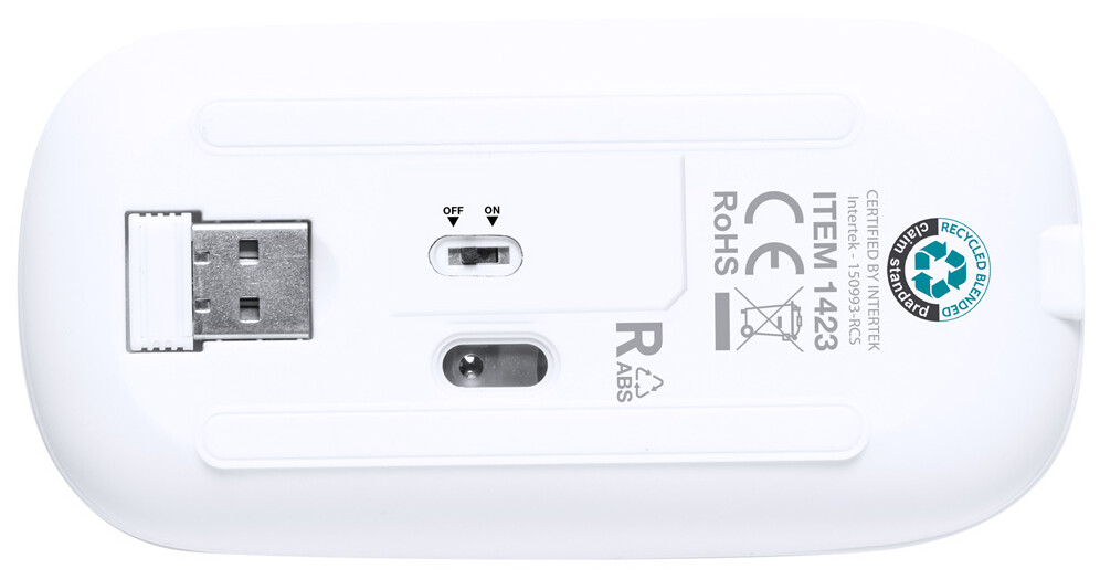 Bezdrátová optická myš s krytem z recyklovaného ABS plastu a vestavěnou dobíjecí baterií. Včetně USB nabíjecího kabelu.