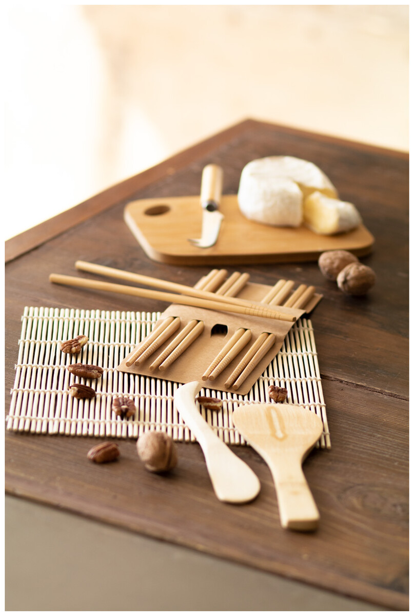 Bambusová sada na přípravu sushi s bambusovou podložkou na sushi, bambusovým nožem a lžící na rýži a 5 páry hůlek. V kraftové papírové krabici.