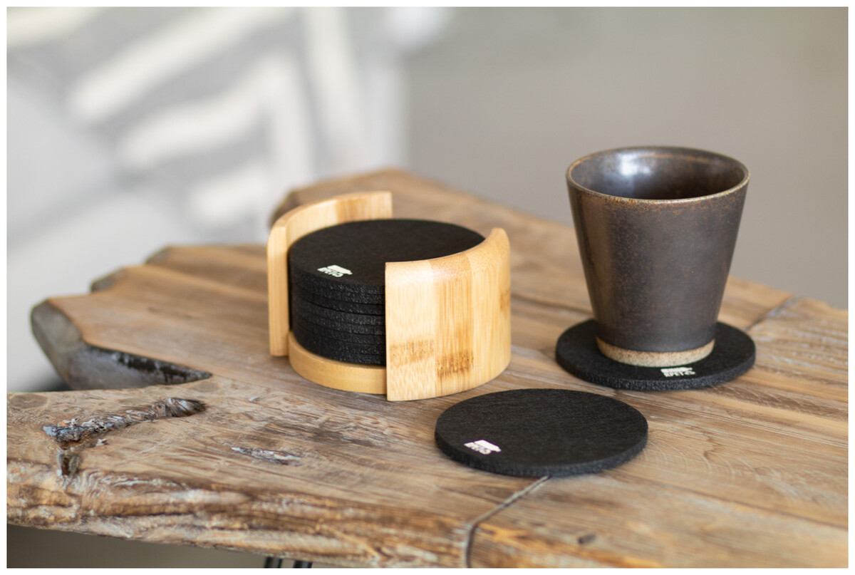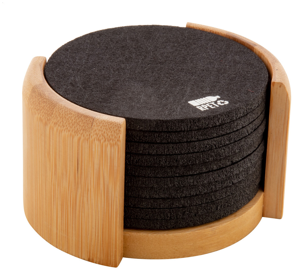 Sada 10 ks RPET filcového podtácku v bambusovém držáku na stůl. S výrazným logem RPET na každém tácku.