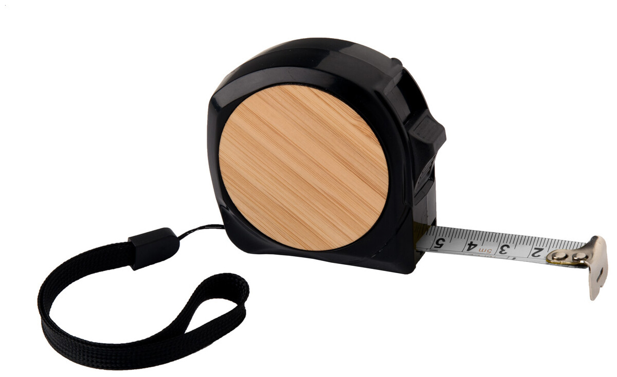 Plastový a bambusový svinovací metr s aretací, kovovým klipem a poutkem na ruku, 5 m.