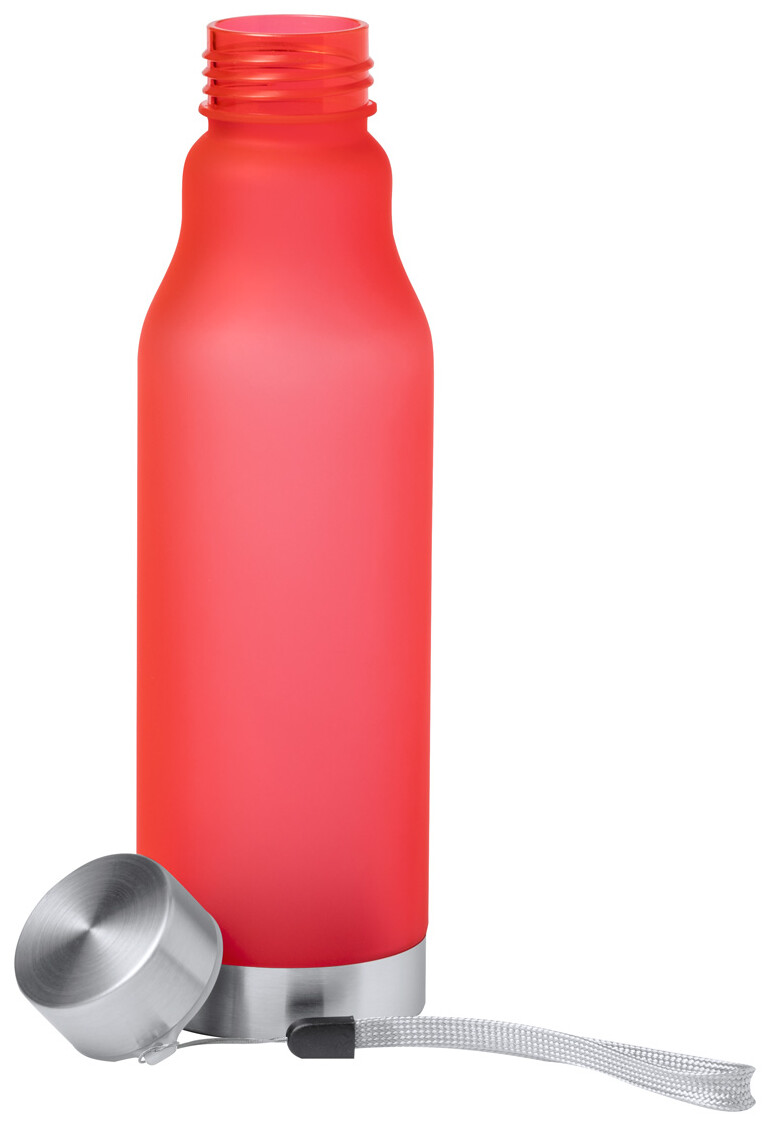 Láhev RPET s popruhem, nerezovým uzávěrem a dnem, 600 ml. Bez BPA. Nevhodné pro sycené nápoje.