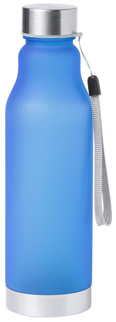 Láhev RPET s popruhem, nerezovým uzávěrem a dnem, 600 ml. Bez BPA. Nevhodné pro sycené nápoje.