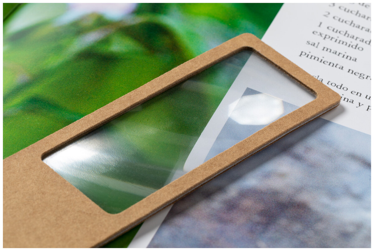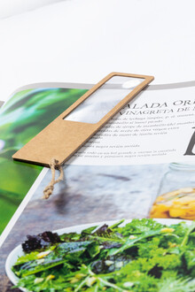 Záložka z recyklovaného papíru s lupou a provázkem.