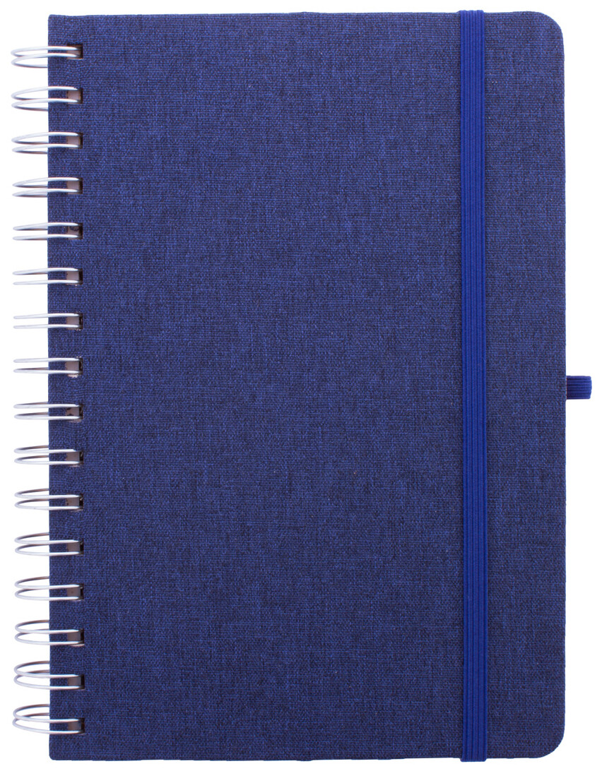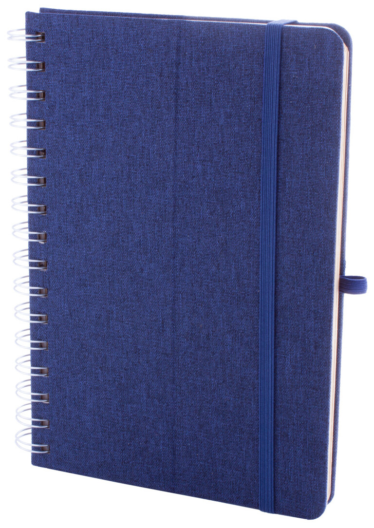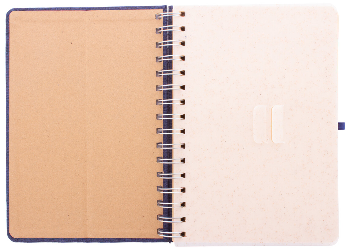 Spirálový blok A5 s deskami potaženými polyesterem RPET s plastovým držákem na mobil a tablet z pšeničné slámy. Se 70 linkovanými listy z recyklovaného kraftového papíru, gumičkou a držákem na pero.