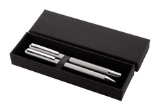Sada pera z recyklovaného hliníku s rollerem a kuličkovým perem v černé papírové dárkové krabičce. S modrou náplní.