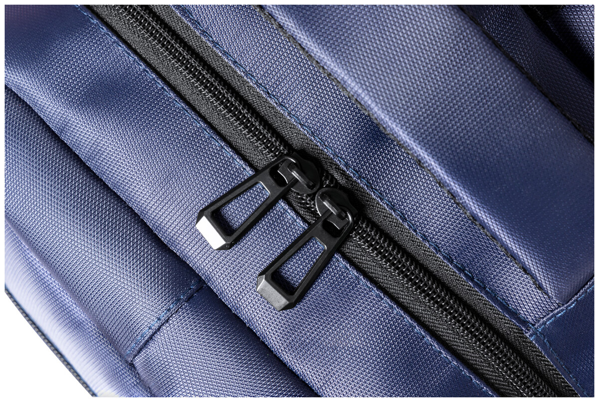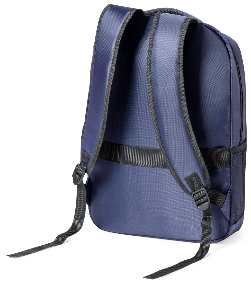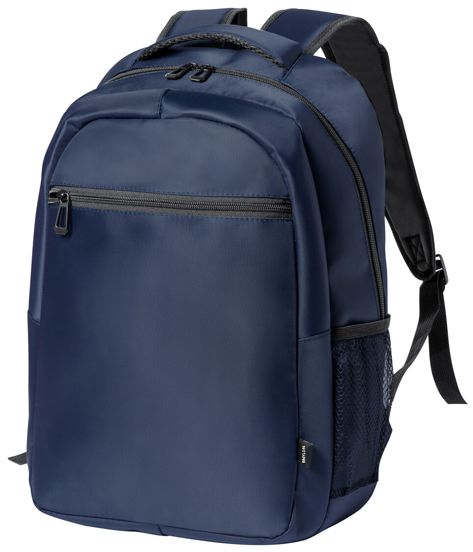 Batoh RNYLON s přihrádkami na zip, bočními kapsami ze síťoviny, polstrovanou kapsou na notebook (15"), popruhem na vozík, polstrovanými zády a ramenními popruhy. 420D recyklovaný nylon s výrazným štítkem RNYLON.