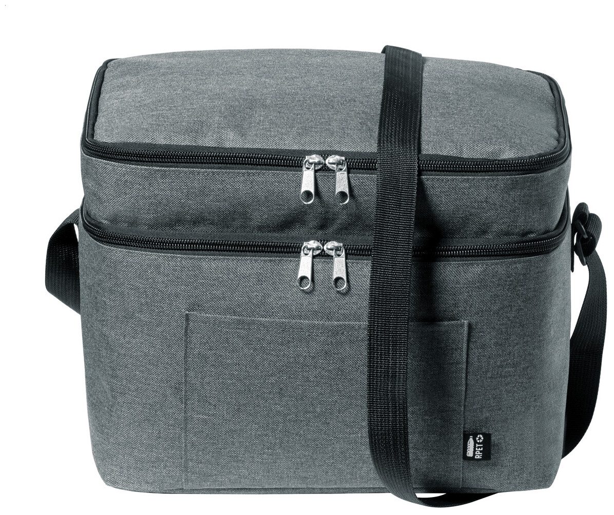 Chladicí taška z 600D RPET polyesteru s PEVA výstelkou, se 2 přihrádkami na zip a nastavitelným ramenním popruhem. S výrazným štítkem RPET.